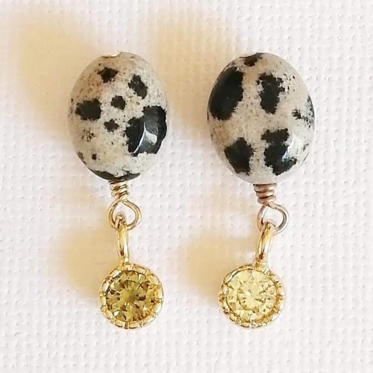 小振りのダルメシアンジャスパーにシャンパンカラーの極小キュービックジルコニアが揺れる大人ピアス♡