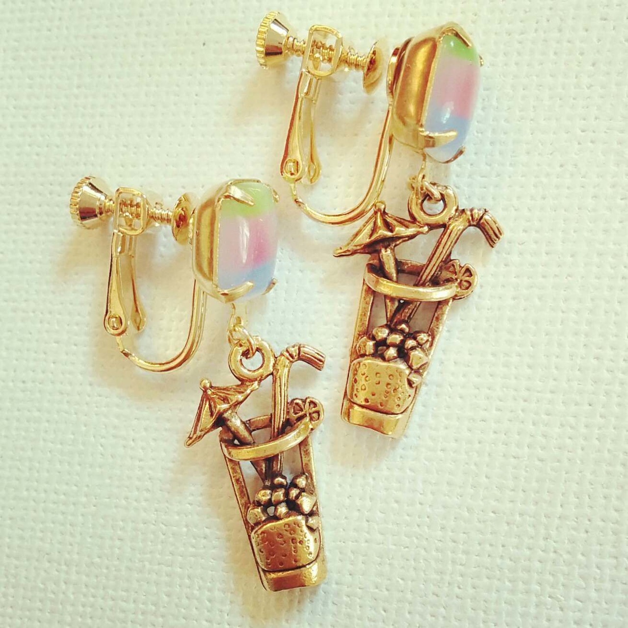 マルチカラーのビンテージストーンにカクテルチャームのピアス&イヤリング